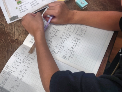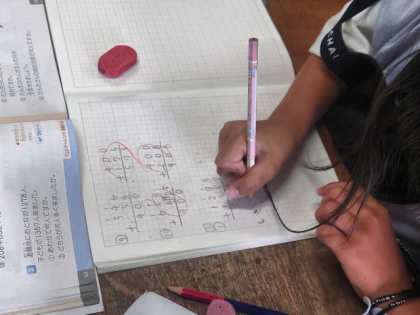 算数科の時間は、3けたのたし算・ひき算の「たしかめポイント」(まとめの問題)を一生懸命解いています。