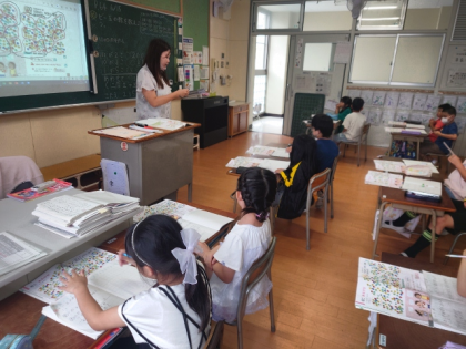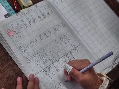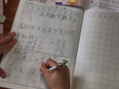 算数科の時間は、教科書のイラストのビー玉の数を予想してから、実際にいくつあるのか数えます。