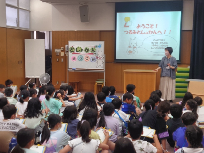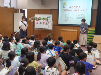 開館前の9時30 分に図書館にに入れていただき、多目的室で鶴見図書館について、いろいろなことを教えてくださいました。