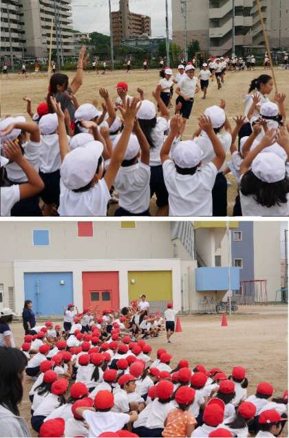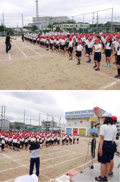 ようやく雨がやみました。運動場で全体練習です。閉会式の練習をしました。応援団退場のウェーブの練習をしました。1年生は初めてですね。わかったかな。