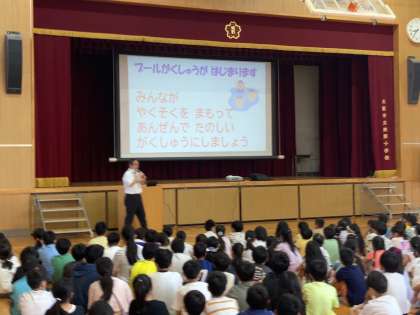 安全に気を付けて、目標をもって、楽しいプール学習にしてください。」
