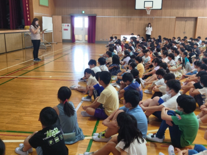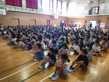 今朝の児童朝会は、全学年の子どもたちが講堂に集まって行いました。