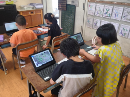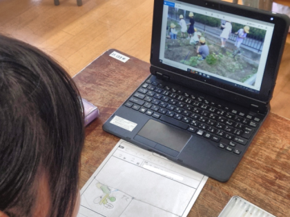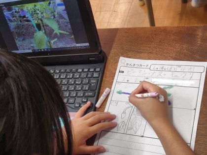 生活科の時間は、ピーマン、ナス、キュウリなどを1人1台PCで撮影した写真を見ながら観察し、シートに記録しました。