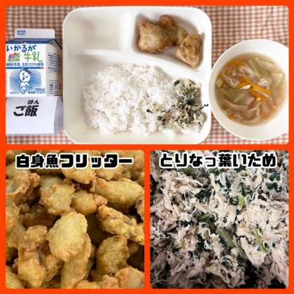 今日の献立は、白身魚フリッター・すまし汁・とりなっ葉いため・ごはん・牛乳でした。