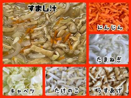 すまし汁は、うすあげ・キャベツ・たまねぎ・たけのこ・にんじんを使用しています。