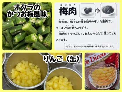 「オクラのかつお梅風味」は、オクラを焼き物で蒸し、かつおぶし・梅肉・砂糖・米酢・うすくちしょうゆを合わせた調味液を配缶時にかけ、あえたものです。今日のオクラは高知県産です。