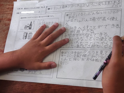 今日は、資源ごみのゆくえについて調べ、ごみを分別することのよさについて考えました。