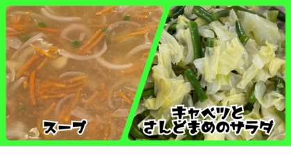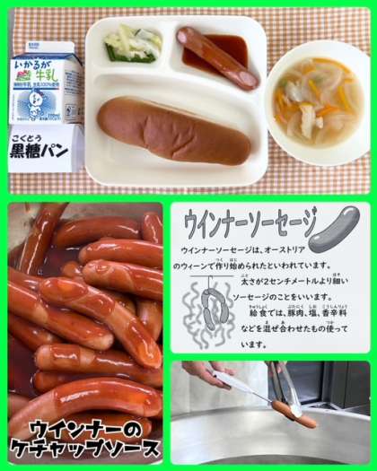 今日の献立は、ウインナーのケチャップソース・スープ・キャベツとさんどまめのサラダ・黒糖パン・牛乳でした。