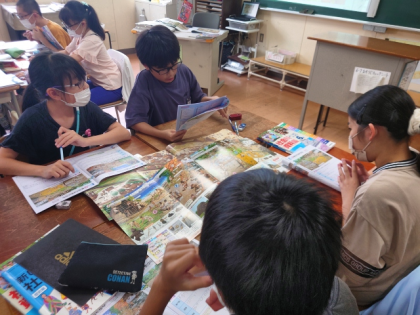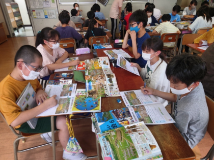 社会科の時間は、イラストを見ながら縄文時代と弥生時代の人びとの食べ物、建物、道具などの生活のようすのちがいを見つけてワークシートにまとめ、気付いたことをグループで交流し合いました。