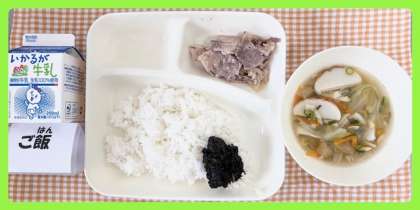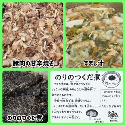 今日の献立は、豚肉の甘辛焼き・五目汁・のりのつくだ煮・ごはん・牛乳でした。