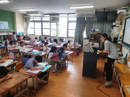 音楽科の時間は、みんなで元気よく「校歌」「とんでったバナナ」などの曲を歌ったり、「アルプス一万尺」の曲に合わせて手遊びをしたりして楽しく学習しました。