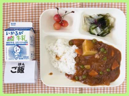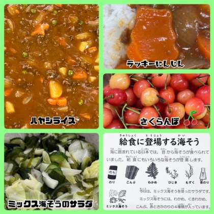 今日の献立は、ハヤシライス・ミックス海そうのサラダ・さくらんぼ・牛乳でした。