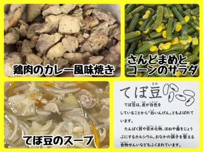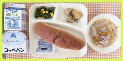 今日の献立は、鶏肉のカレー風味焼き・てぼ豆のスープ・さんどまめとコーンのサラダ・コッペパン・ブルーベリージャム・牛乳でした。