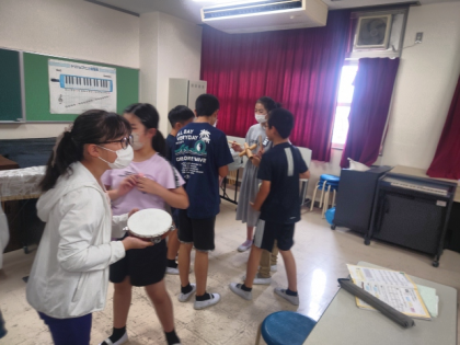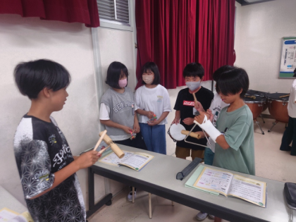 また、「スポーツ」をテーマに、3つのリズムに合った楽器を選び、グループでリズムを重ねて演奏しました。