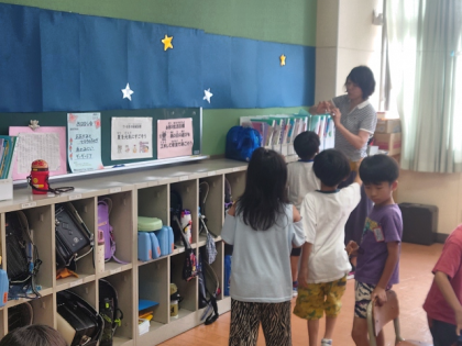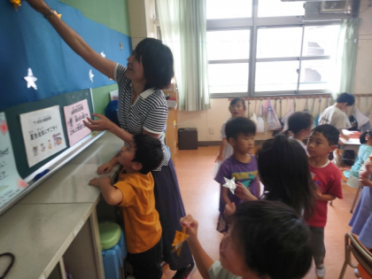 できた飾りは、教室背面の「夜空」に飾っていきます。
