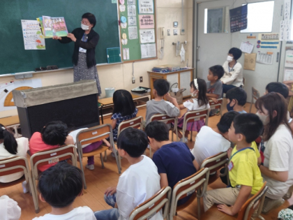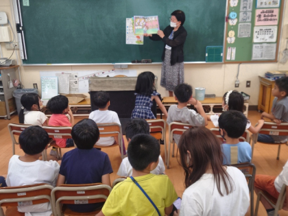 各教室に「鶴見おはなしサークルでんでんむし」の皆さんに来ていただいて、「おはなし会」を開きました。