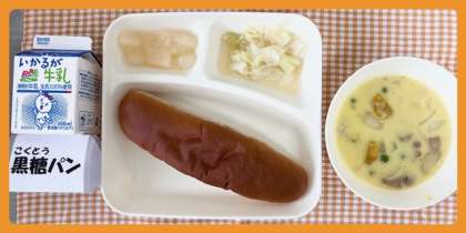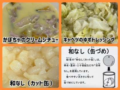 今日の献立は、かぼちゃのクリームシチュー・キャベツのゆず・ドレッシング・和なし(カット缶)・黒糖パン・牛乳でした。