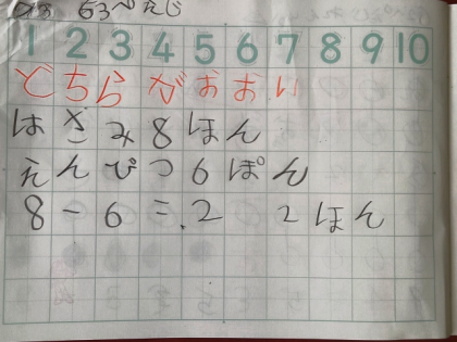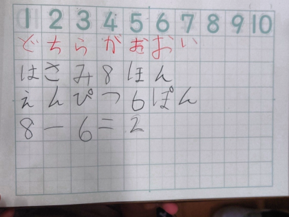 今日の問題は「はさみが 8ほん、えんぴつが 6ぽんあります。どちらが なんぼん おおいですか。」。