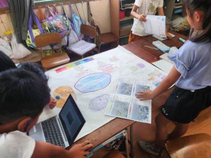社会科の時間には、先日の校外学習で、ハルカスの展望階から見えたものをグループでまとめました。
