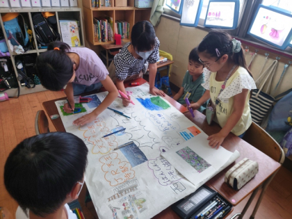 東・西・南・北のそれぞれの方向に見えたものを模造紙いっぱいに書いています。