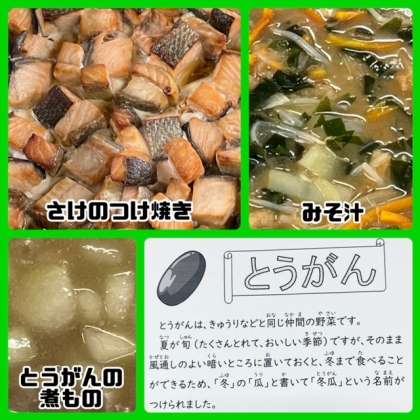 今日の献立は、さけのつけ焼き・みそ汁・とうがんの煮もの
