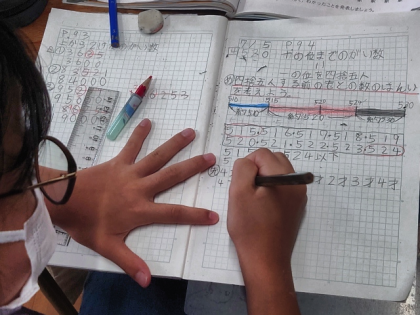 算数科の時間は、十の位までの概数にしたとき「約520」になる数のはんいを考えました。