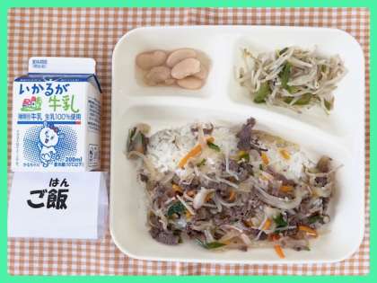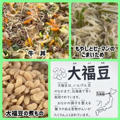 今日の献立は、牛丼・もやしとピーマンのごまいため・大福豆(おおふくまめ)の煮もの・牛乳でした。
