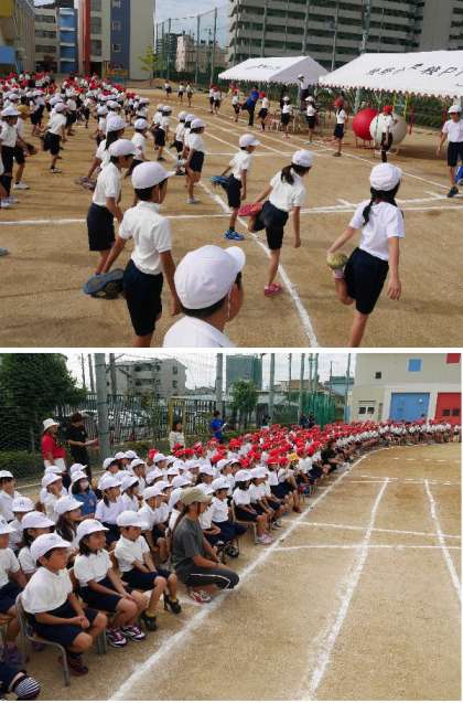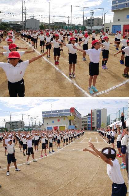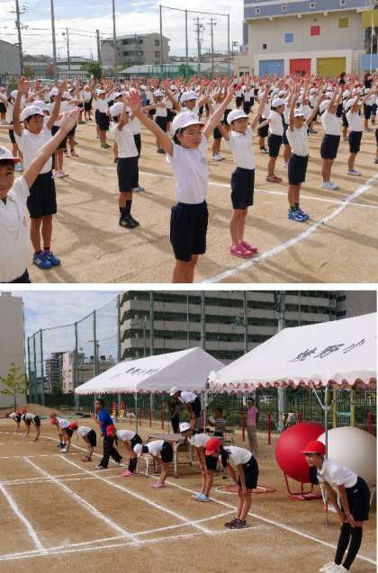 第3回目の運動会の全体練習でした。体育委員がラジオ体操や整理体操の模範としてがんばっています。整理体操はみんなで考えたオリジナルだそうです。