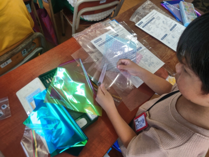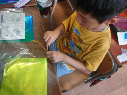 図工科の時間は、透明の袋や色シート、カラーモールなどを使って形を作っていきます。