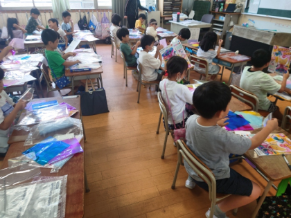 図工科の時間は、透明の袋や色シート、カラーモールなどを使って形を作っていきます。