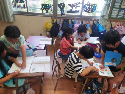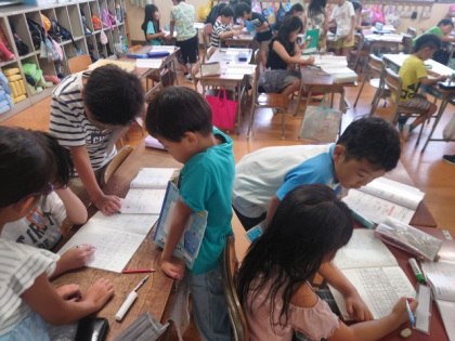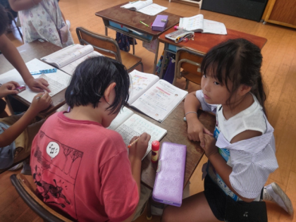 お互いにわからないところを教え合いながら問題を考えています。