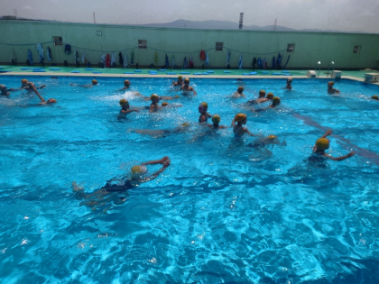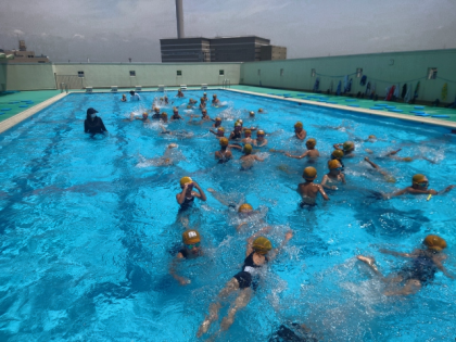 水慣れ、けのび、ばた足に練習をした後、学習の終わりに「宝さがし」をしました。