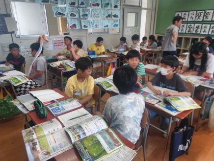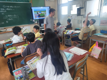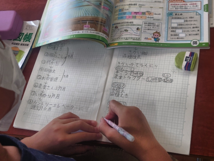 社会科の時間は、庄内平野で、米作りをどのように行っているのか、教科書や資料集の資料を使って調べました。