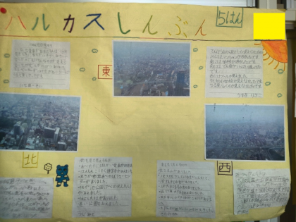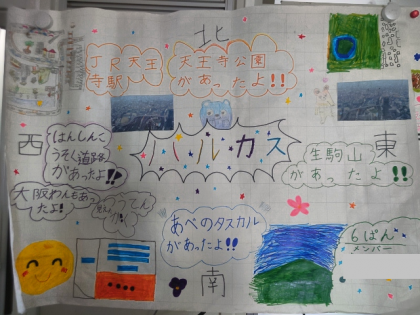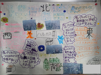 校外学習で、ハルカスの展望階から東・西・南・北のそれぞれの方向に見えたものを、グループで協力して模造紙にまとめました。