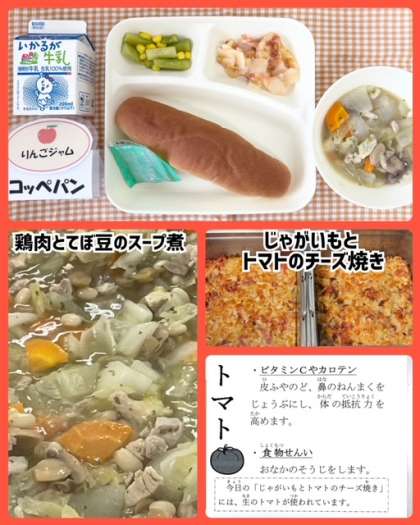 今日の献立は、鶏肉とてぼ豆のスープ煮・じゃがいもとトマトのチーズ焼き・グリーンアスパラガスとコーンのサラダ・コッペパン・りんごジャム・牛乳でした。