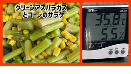 サラダは、グリーンアスパラガスとコーンを各々ゆで、砂糖・塩・ワインビネガー・綿実油で作ったドレッシングであえたものです。今日のグリーンアスパラガスは、熊本県産です。