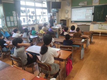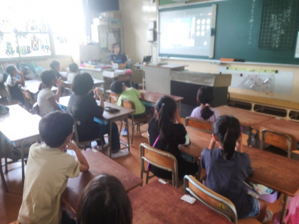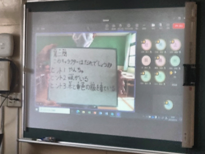 今日の児童集会は、ドレミ班(たてわり班)ごとに教室に集合して、オンラインで行いました。