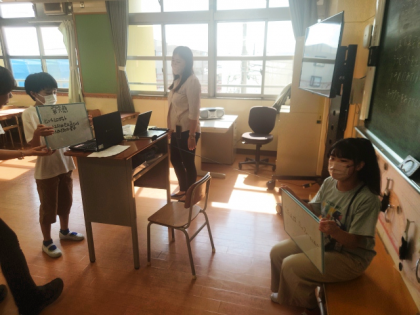 今日の児童集会は、ドレミ班(たてわり班)ごとに教室に集合して、オンラインで行いました。