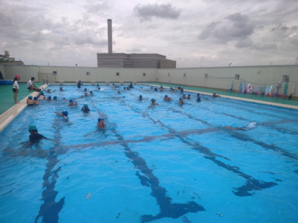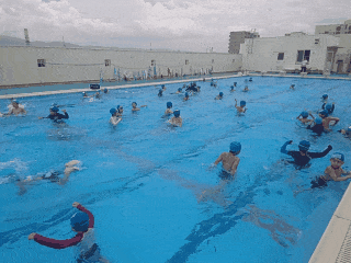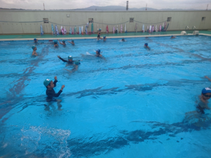 顔をつけたり、もぐったり、水の中を歩いたりして水に慣れる運動しています。