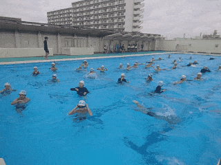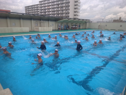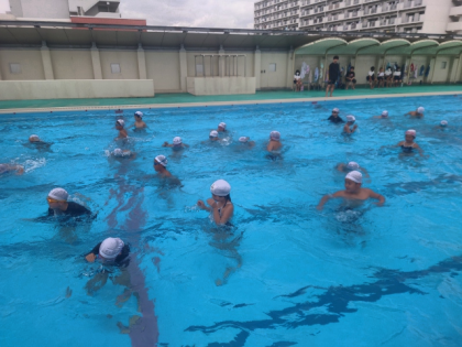 音楽に合わせて水慣れをした後、けのび、ばた足、クロール、そして、平泳ぎの足のかき方の練習をしました。