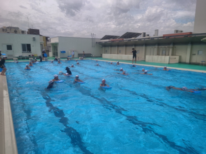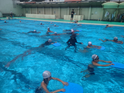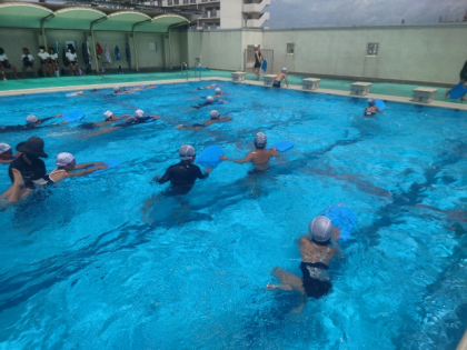 音楽に合わせて水慣れをした後、けのび、ばた足、クロール、そして、平泳ぎの足のかき方の練習をしました。