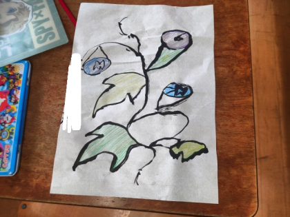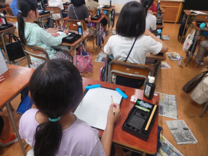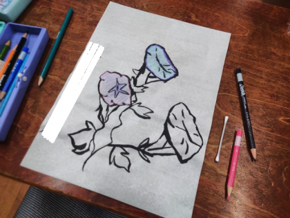 書写の時間は、墨の使い方や筆の持ち方、腕の動かし方を確認するために、毛筆で「あさがお」の絵を描きました。