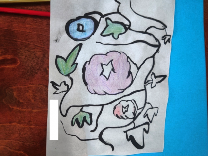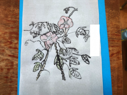書写の時間は、墨の使い方や筆の持ち方、腕の動かし方を確認するために、毛筆で「あさがお」の絵を描きました。