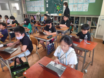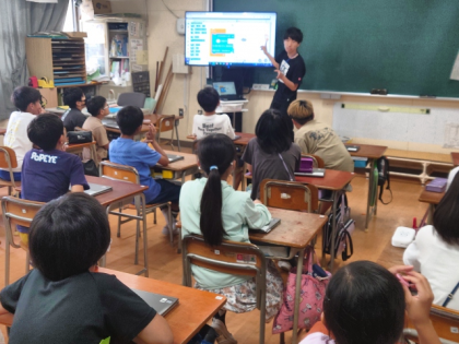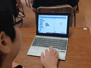 1人1台PCのプログラミングアプリ「Scratch」を使って、キャラクターが移動するプログラムを組み立てています。