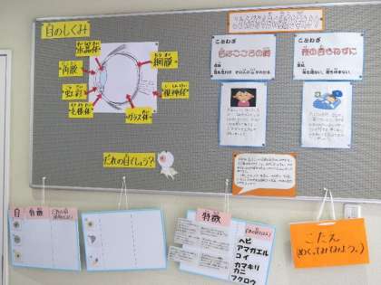 毎月掲示が変わる保健室前の掲示板。保健室の先生が工夫をこらしています。今回は「目のしくみ」についてです。