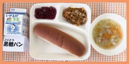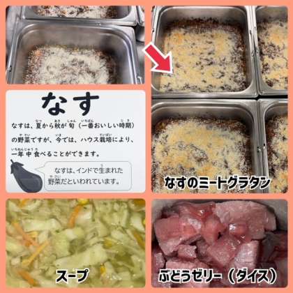 今日の献立は、なすのミートグラタン・スープ・ダイスゼリー (ぶどう)・黒糖パン・牛乳でした。