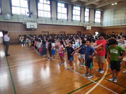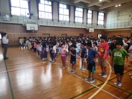 1学期の終業式は、全校のみんなで講堂に集まって行いました。