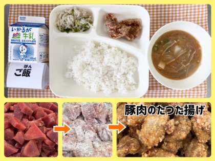 献立は、豚肉のたつたあげ・みそ汁・切干しだいこんのゆずの香あえ・ごはん・牛乳でした。