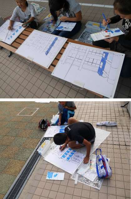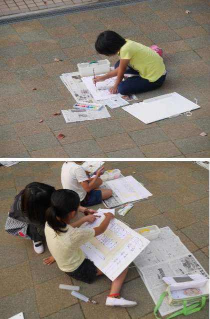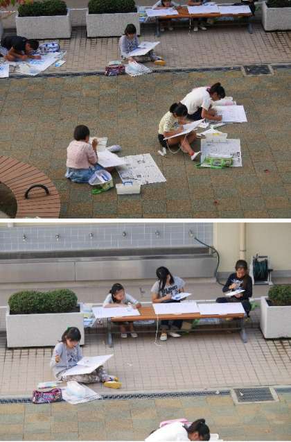 5年生が中庭にでて、校舎を見上げて絵に着色して完成にがんばってます。