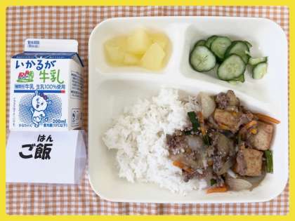 今日の献立は、マーボーあつあげ丼・あっさりきゅうり・りんご(カット缶)・牛乳でした。